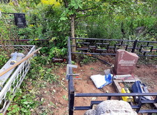 Затем мы приступили к монтажу заранее привезённой на кладбище простой металлической оградки. Параллельно с установкой ограждения мы окончательно очистили участок, а также сварили металлический каркас по периметру могилы. Он не только придаст дополнительную жёсткость ограждению, но и послужит бортами для будущего покрытия.