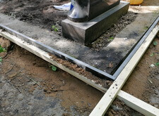 Предварительно застеленную геотекстилем территорию участка засыпаем пескобетонной смесью. На неё крепим основание зеркальных памятников, выставляем общий цветник, укладываем гранитную брусчатку.