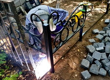 Монтируем оградку, вваривая согласованные с клиентом уголки. По низу пускаем металлическую ленту, которая обозначит границу выложенной брусчаткой территории.