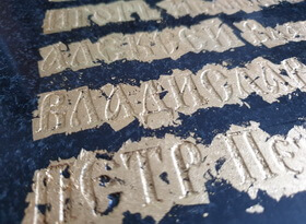 Саму гравировку мы выполнили при помощи пескоструйного аппарата и сразу же принялись за покрытие текста сусальным золотом. Начали с орнамента, так как работать с элементами декора проще, чем с печатным текстом.